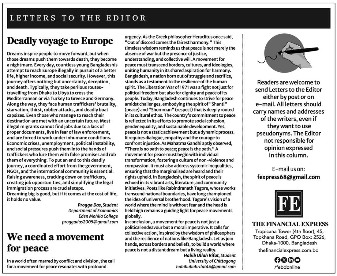 Dreams inspire people to move forward, but when those dreams push them towards death, they become a nightmare. Every day, countless young Bangladeshis attempt to reach Europe illegally in pursuit of a better life, higher income, and social security. However, this journey offers nothing but uncertainty, deception, and death. Typically, they take perilous routes-travelling from Dhaka to Libya to cross the Mediterranean or via Turkey to Greece and Germany. Along the way, they face human traffickers' brutality, starvation, thirst, robber attacks, and deadly boat capsizes. Even those who manage to reach their destination are met with an uncertain future. Most illegal migrants cannot find jobs due to a lack of proper documents, live in fear of law enforcement, and are forced to work under inhumane conditions. Economic crises, unemployment, political instability, and social pressures push them into the hands of traffickers who lure them with false promises and rob them of everything. To put an end to this deadly journey, a coordinated effort from the government, NGOs, and the international community is essential. Raising awareness, cracking down on traffickers, creating job opportunities, and simplifying the legal immigration process are crucial steps.