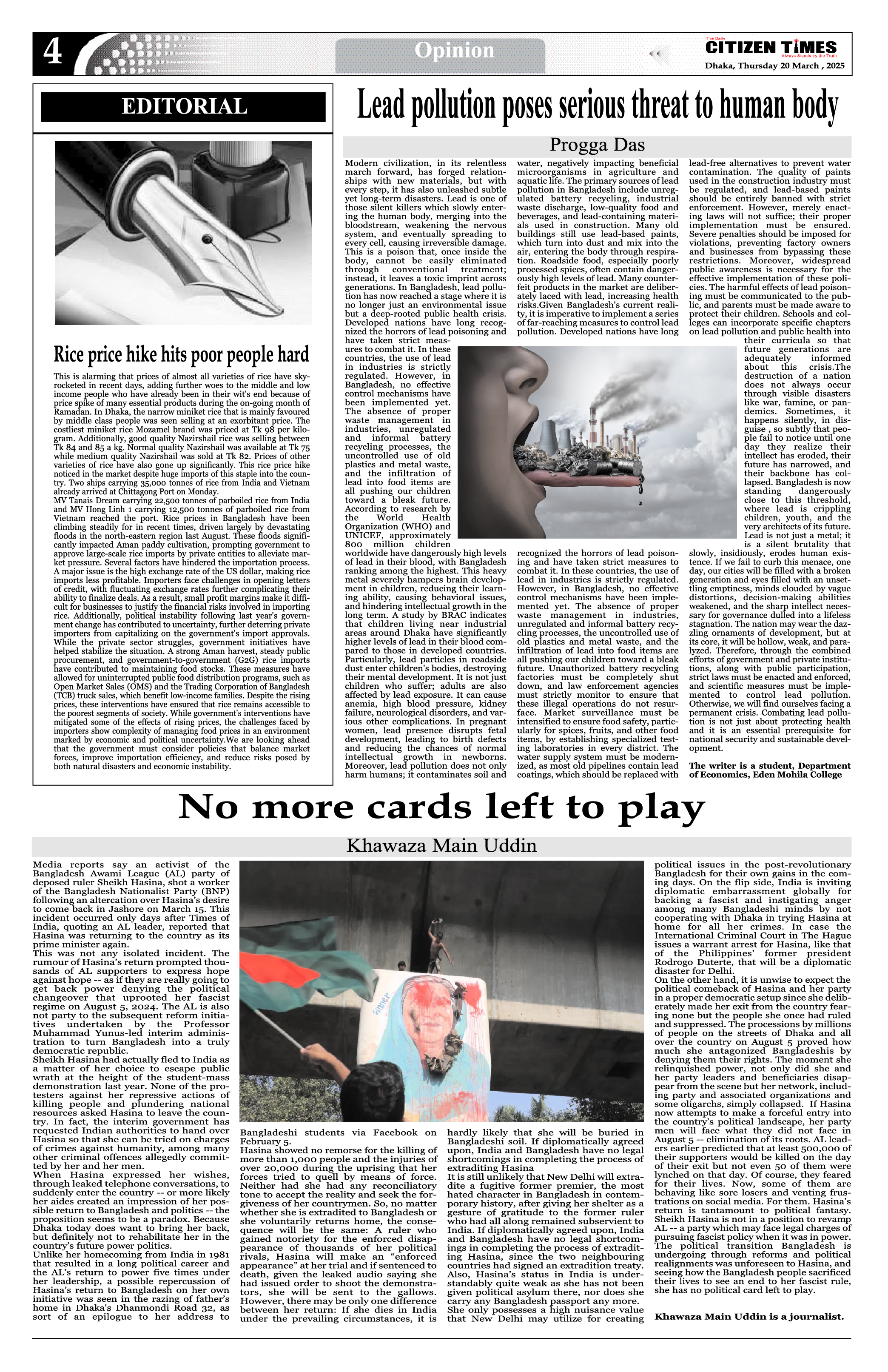 HomeThe Daily Citizen Times. Lead Pollution Poses Serious Threat to human Body progga March 19, 2025 0 The Daily Citizen Times.,Thursday, "March 20, 2025" E-paper Click Here You Might Like View all