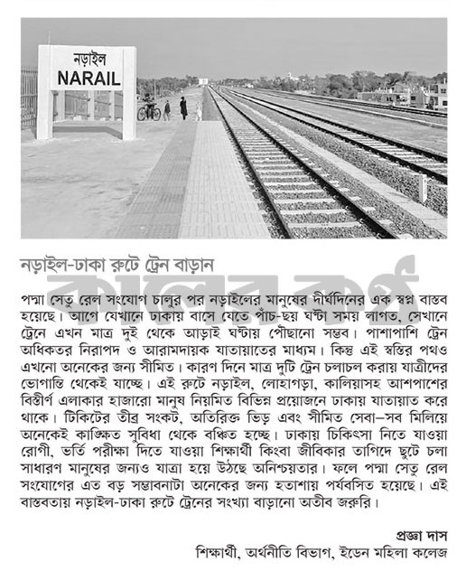 । রেল পদ্মা সেতু রেল সংযোগ চালুর পর । চালুর পর নড়াইলের নড়া মানুষের দীর্ঘদিনের এক এক স্বপ্ন বাস্তব হয়েছে। আগে যেখানে ঢাকায় বাসে যেতে পাঁচ-ছয় ঘণ্টা সময় লাগত, সেখানে ট্রেনে এখন মাত্র দুই থেকে আড়াই ঘণ্টায় পৌঁছানো সম্ভব। পাশাপাশি ট্রেন অধিকতর নিরাপদ ও আরামদায়ক যাতায়াতের মাধ্যম। কিন্তু এই স্বস্তির পথও এখনো অনেকের জন্য সীমিত। কারণ দিনে মাত্র দুটি ট্রেন চলাচল করায় যাত্রীদের ভোগান্তি থেকেই যাচ্ছে। এই রুটে নড়াইল, লোহাগড়া, কালিয়াসহ আশপাশের বিস্তীর্ণ এলাকার হাজারো মানুষ নিয়মিত বিভিন্ন প্রয়োজনে ঢাকায় যাতায়াত করে থাকে। টিকিটের তীব্র সংকট, অতিরিক্ত ভিড় এবং সীমিত সেবা-সব মিলিয়ে অনেকেই কাঙ্ক্ষিত সুবিধা থেকে বঞ্চিত হচ্ছে। ঢাকায় চিকিৎসা নিতে যাওয়া রোগী, ভর্তি পরীক্ষা দিতে যাওয়া শিক্ষার্থী কিংবা জীবিকার তাগিদে ছুটে চলা সাধারণ মানুষের জন্যও যাত্রা হয়ে উঠছে অনিশ্চয়তার। ফলে পদ্মা সেতু রেল সংযোগের এত বড় সম্ভাবনাটা অনেকের জন্য হতাশায় পর্যবসিত হয়েছে। এই বাস্তবতায় নড়াইল-ঢাকা রুটে ট্রেনের সংখ্যা বাড়ানো অতীব জরুরি।